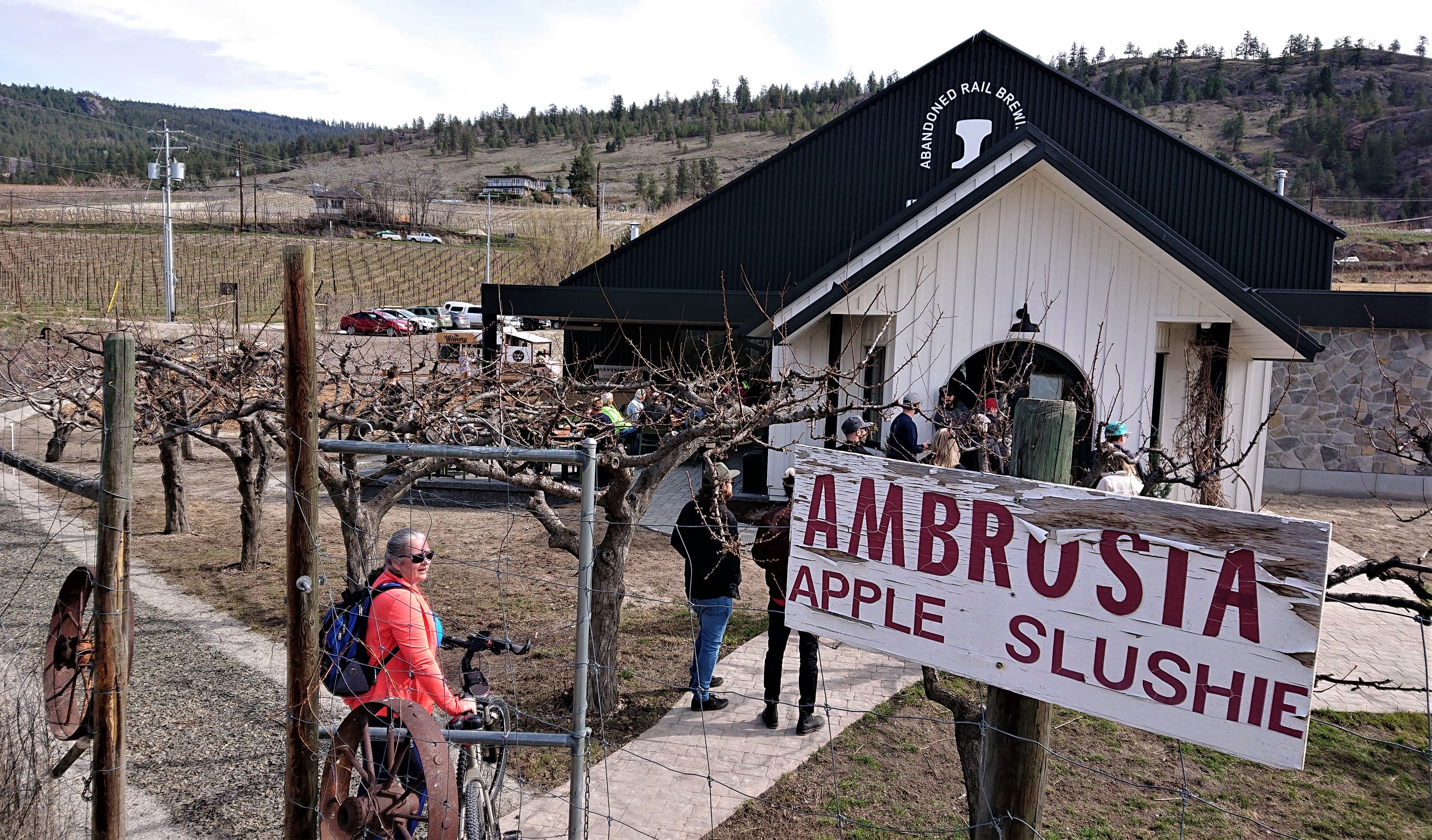 The brewery is just on the outskirts of Naramata, the premiere wine region of the Okanagan. The site they built on used to be a ‘slushie’ spot, where trail users could get slushies made with local Ambrosia apples……the sign is still there…!!